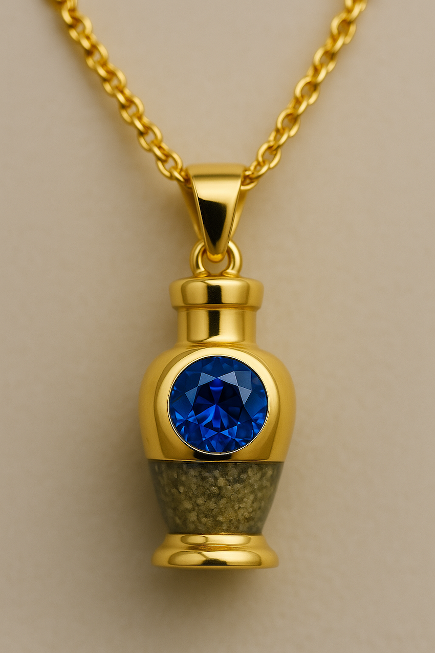 Each urn is individually shaped and polished to highlight the natural beauty of stones such as jade, onyx, and quartz, ensuring that every piece is both refined and enduring. In addition, the pendants—available in gold, white gold, and platinum—are set with precious gemstones and designed to embody both elegance and remembrance.
